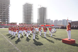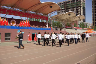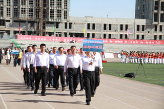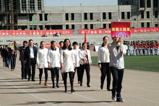 開幕式由黨政辦公室主任胡利春主持,在雄壯高昂的運(yùn)動員進(jìn)行曲中,各系學(xué)生和教工方隊(duì),機(jī)關(guān)、教輔單位職工方隊(duì),步伐矯健,口號響亮,依次走過主席臺接受檢閱。隆重的入場式后,開幕式舉行了莊嚴(yán)的升國旗儀式,在嘹亮的國歌聲中,五星紅旗冉冉升起。