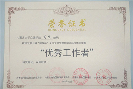 近日,第十屆“挑戰(zhàn)杯”全區(qū)大學生課外學術科技作品競賽成績揭曉。我院上報的作品《基于交通大數據預測的路徑誘導系統(tǒng)的開發(fā)》(學生作者:張重慶、劉宇杰、梁瑞田,指導教師:李曉娟、霍月英)獲得科技發(fā)明制作A類三等獎;作品《呼和浩特市、包頭市道路汽車行駛工況的研究》(學生作者:趙亞瓊,指導教師:姚延鋼、楊曉勤)獲得自然科學類學術論文三等獎。我院團委書記高飛被第十屆“挑戰(zhàn)杯”全區(qū)大學生課外學術科技作品競賽組委會評為優(yōu)秀工作者。
