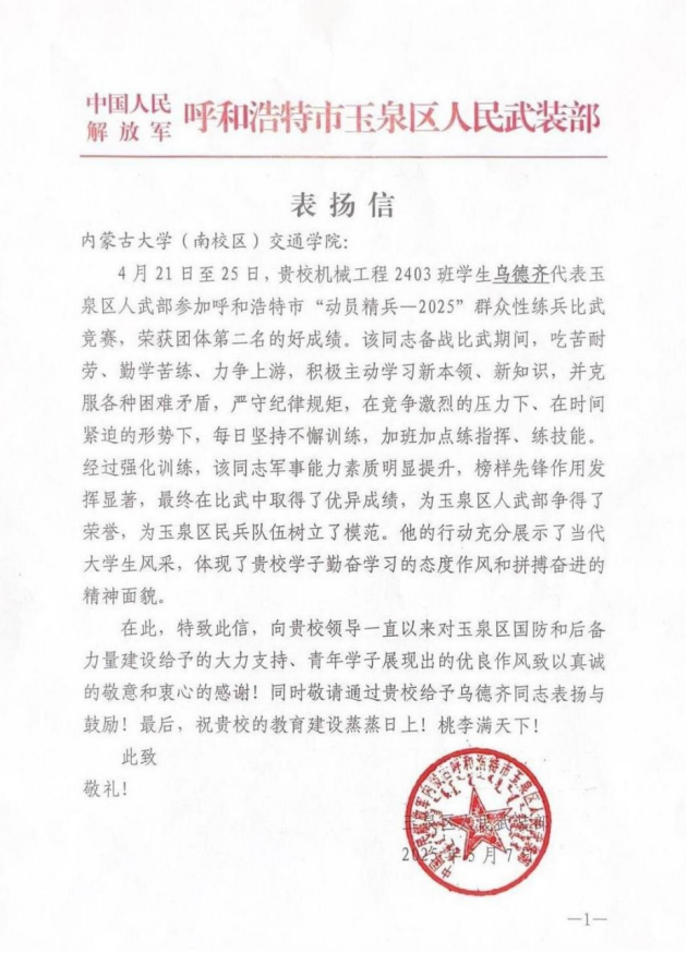 2025年4月21日至25日,烏德齊代表玉泉區(qū)人武部參加呼和浩特市“動(dòng)員精兵—2025”群眾性練兵比武競(jìng)賽,榮獲團(tuán)體第二名成績(jī)。